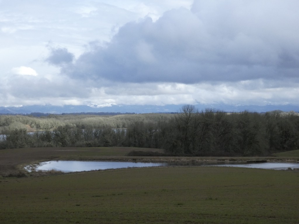 View from hillside over the Willamette Valley towards to the Cascade foothills. Lots of grey-green lichens in the oak trees. Finley Wildlife Refuge
