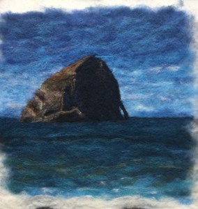 Above is a second rendition in larger scale (12”x 12”) of Haystack Rock by Pacific City, OR. It’s attached to a base of felt I created for the work (via wet felting). I’m still waiting to see if it needs more. The ocean is still not sitting right with me. Time will tell.