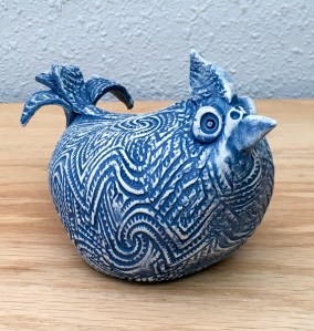 I’m dipping my toes into uncharted territory of wet felting feathers for chicken sculptures. The first one is Miss Lavender who is already on hold for a friend.