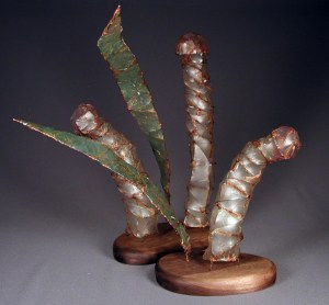 Materials are wire, hog gut, acrylic wash and a walnut base. It comes in 2 sections & are adjustable to please the viewer. It took a couple of trys to get a nicer arrangement of the forms. Title? I’m calling it “The Deflower-er Arrangement”