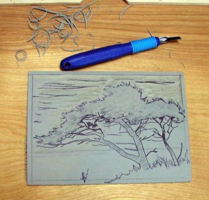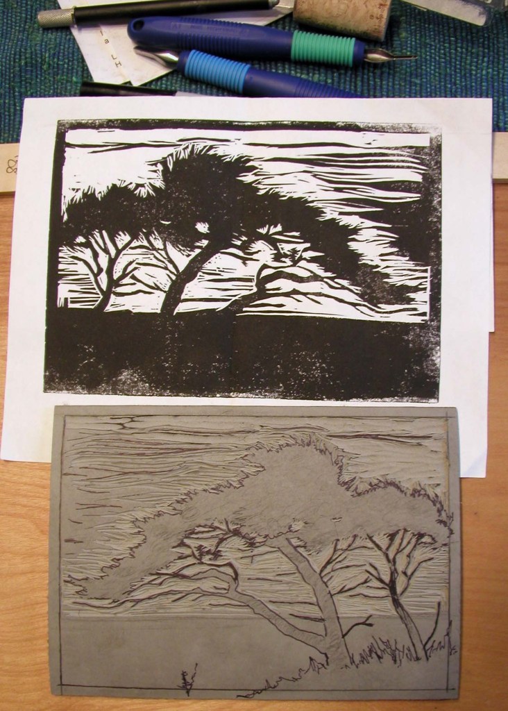 This is a linoleum block print. I’ve drawn the image onto the surface with pencil then reinforced the lines using permanent marker.
