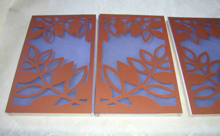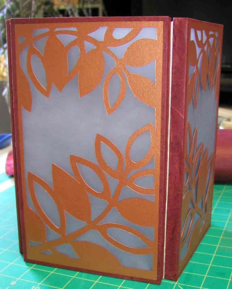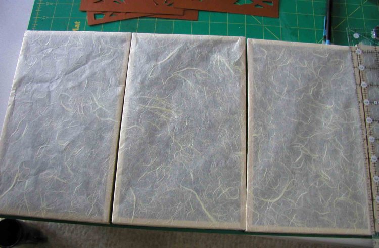 The panels are 6″ wide by 10″ high. The copper colored paper is 100 lb card stock with blue velum behind. Frame constructed from balsa wood. Backing paper is Thai Unryu.