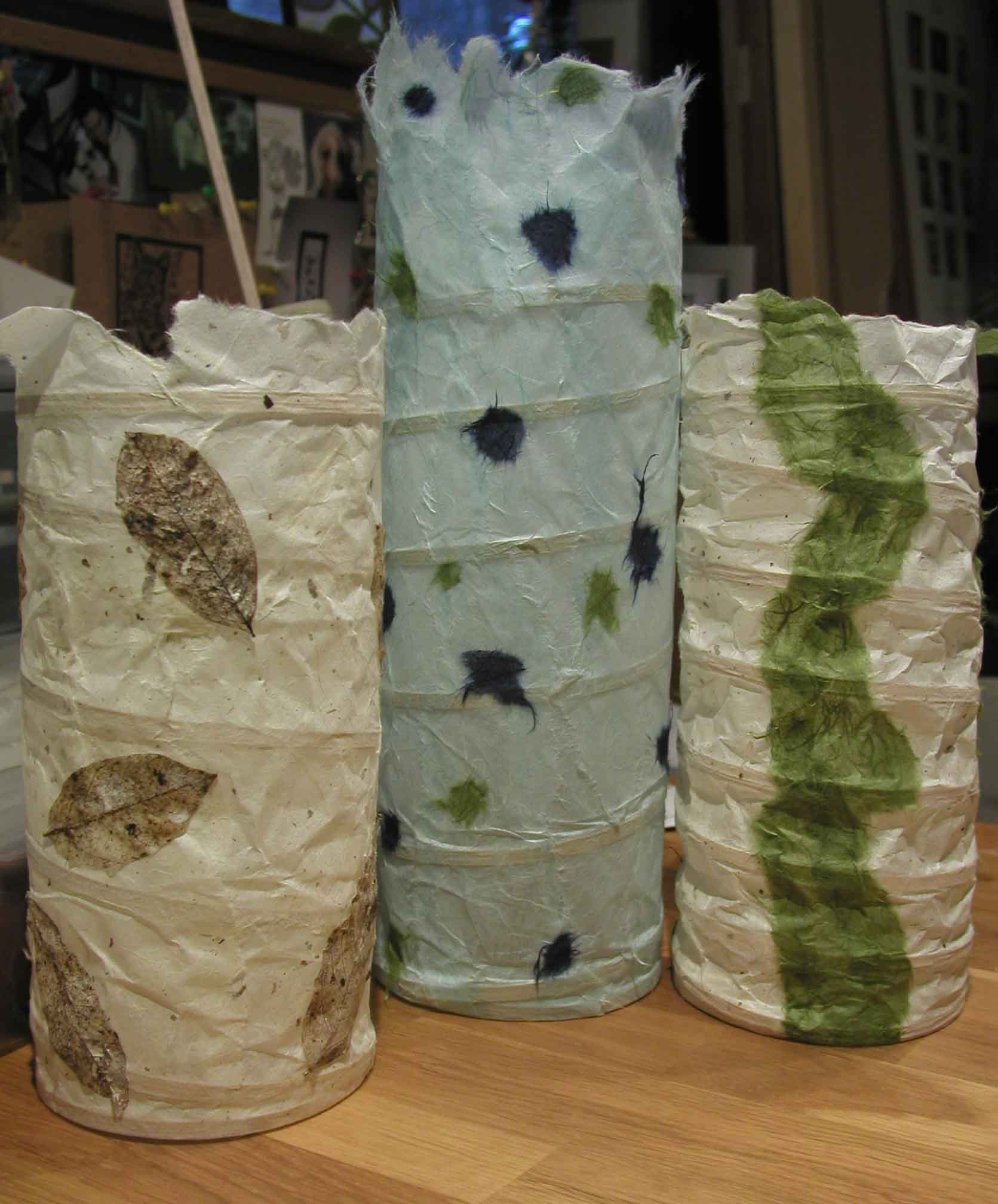 I taped a spiral of flat rattan over a tube form and glued paper over the surface. Could become lamps or containers. Not certain what yet. They remind me of Slinkies but in paper form and yes, they can be compressed! This was another process learned from the Sitka class last summer.