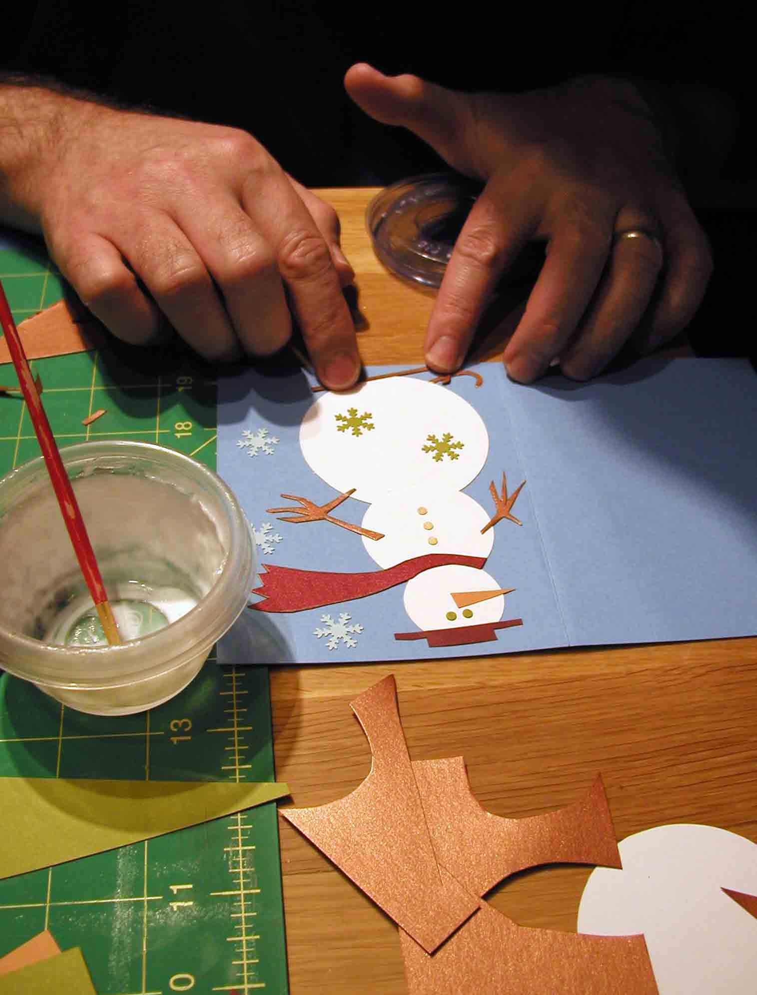 I’ve been the main card producer in our household during the holidays but this year there was a change! Dave decided he really wanted to create personalized cards specifically for his nieces and nephews. He wondered if I “had enough paper to create cards”. Too funny! Guess he really hasn’t looked around the studio space much. Anyway, I wanted to post a couple of photos of him creating the Texas cards. The Chicago crowd received fun tree images without snow (since they have plenty around their house). Texas received the snow people cards.