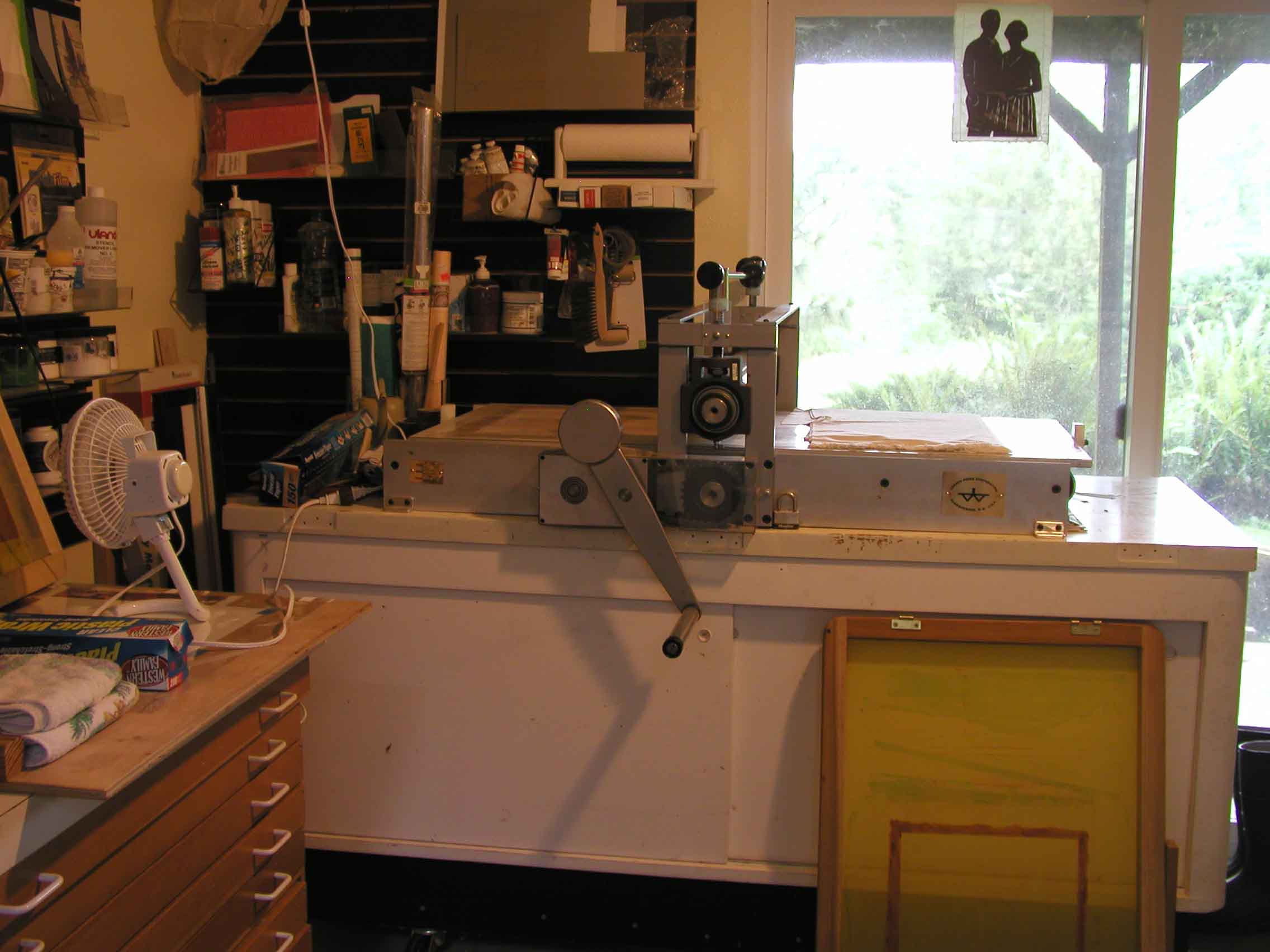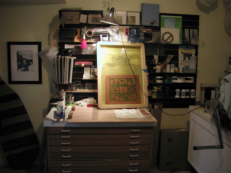 Since there is often quite a bit of down time waiting for screens or paper to dry, I thought it might be nice for you to see my printmaking space prior to finishing the screen show.