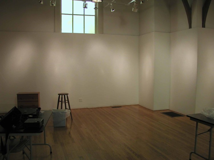 The long wall is right about 15′ then does a little jog at the northwest corner (right corner of the image). This is the area I plan to build the branching forms out of. If you look to the left of the long wall, you will encounter the double doors leading to staff work area and the Corrine Woodman Gallery II.