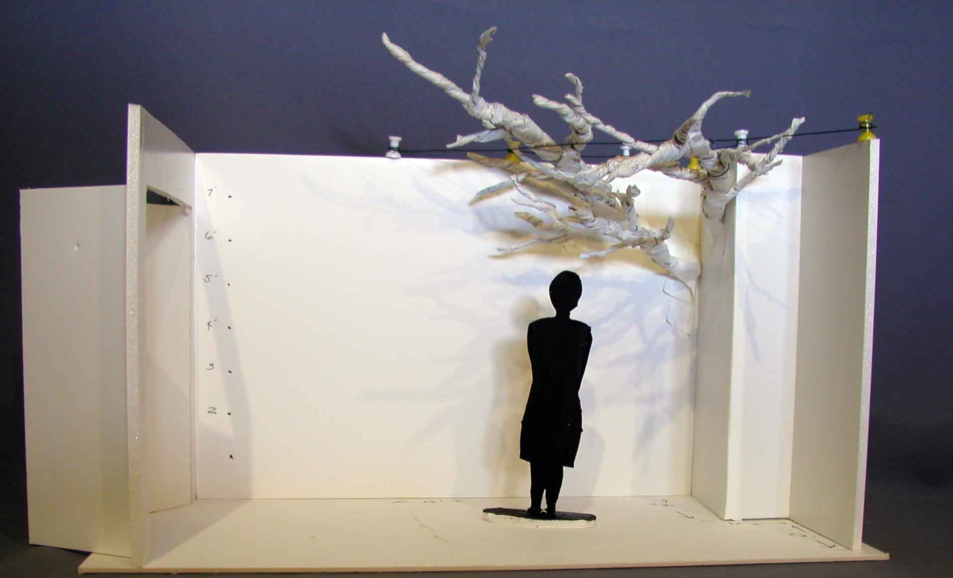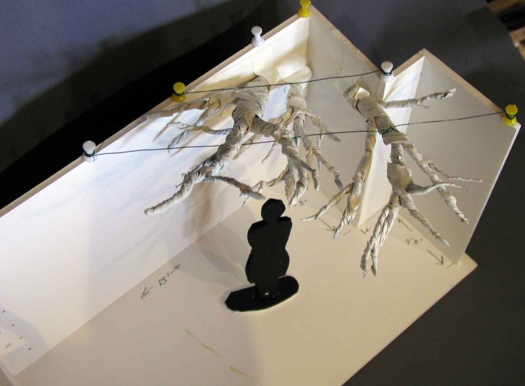 Initially constructed prior to today’s measurements, the long wall should have an additional 3″ added to represent 3 feet. But I think you can get the main idea. The branch forms are not to scale either. They are constructed out of twisted paper to represent the paper & wire armature. The “person” is just under 5.5″ so almost representing an average person’s height (give or take a couple of inches). The push pins represent nails along the small ledge.