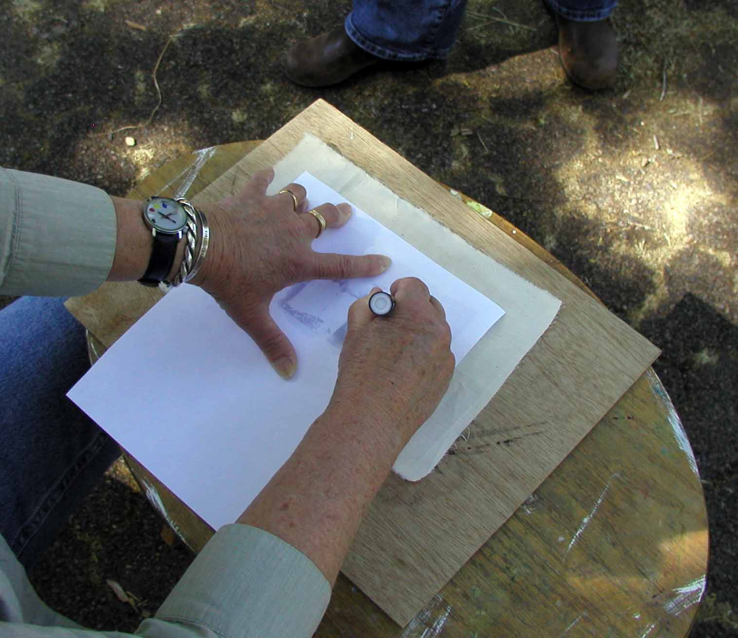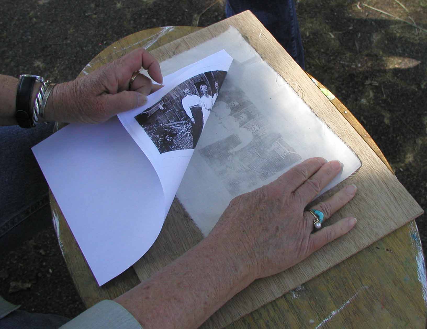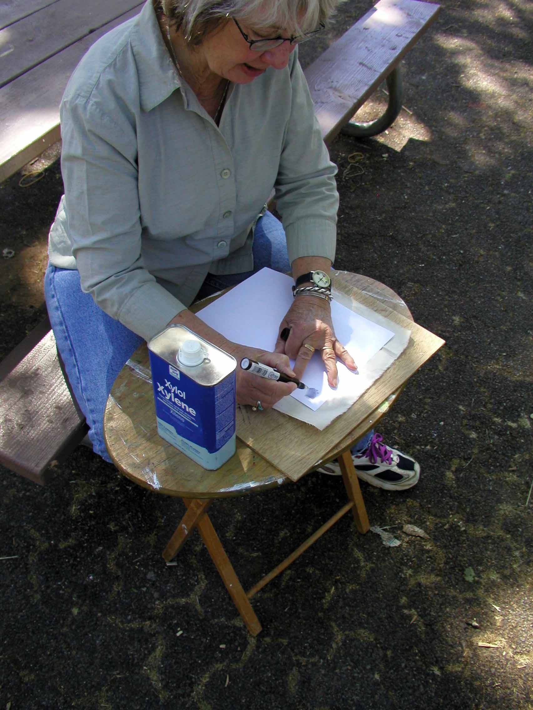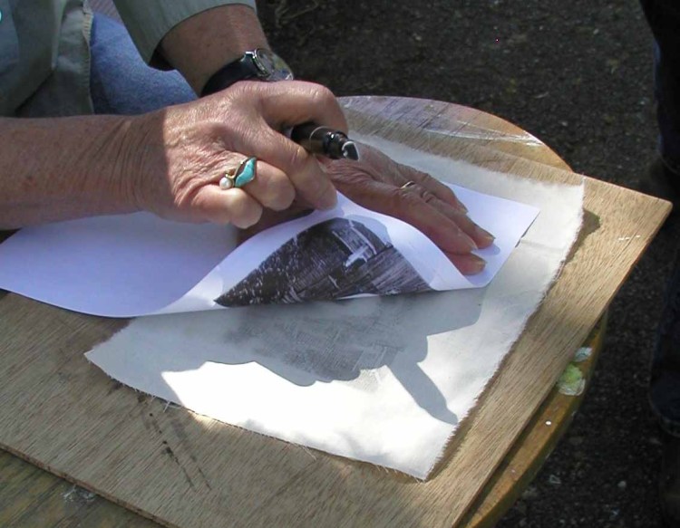 Outside, Carol starts using a solvent marker over the back of her toner based photocopy. Under the photocopy is a piece of fabric that will receive the transfer.