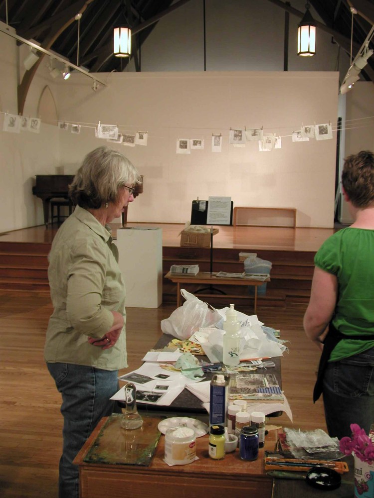 Artist friend Carol Chapel came to participate in Julia’s Laundry Line of Memories and it was a perfect opportunity to document the process. Below, Carol is receiving instructions about the transfer method.