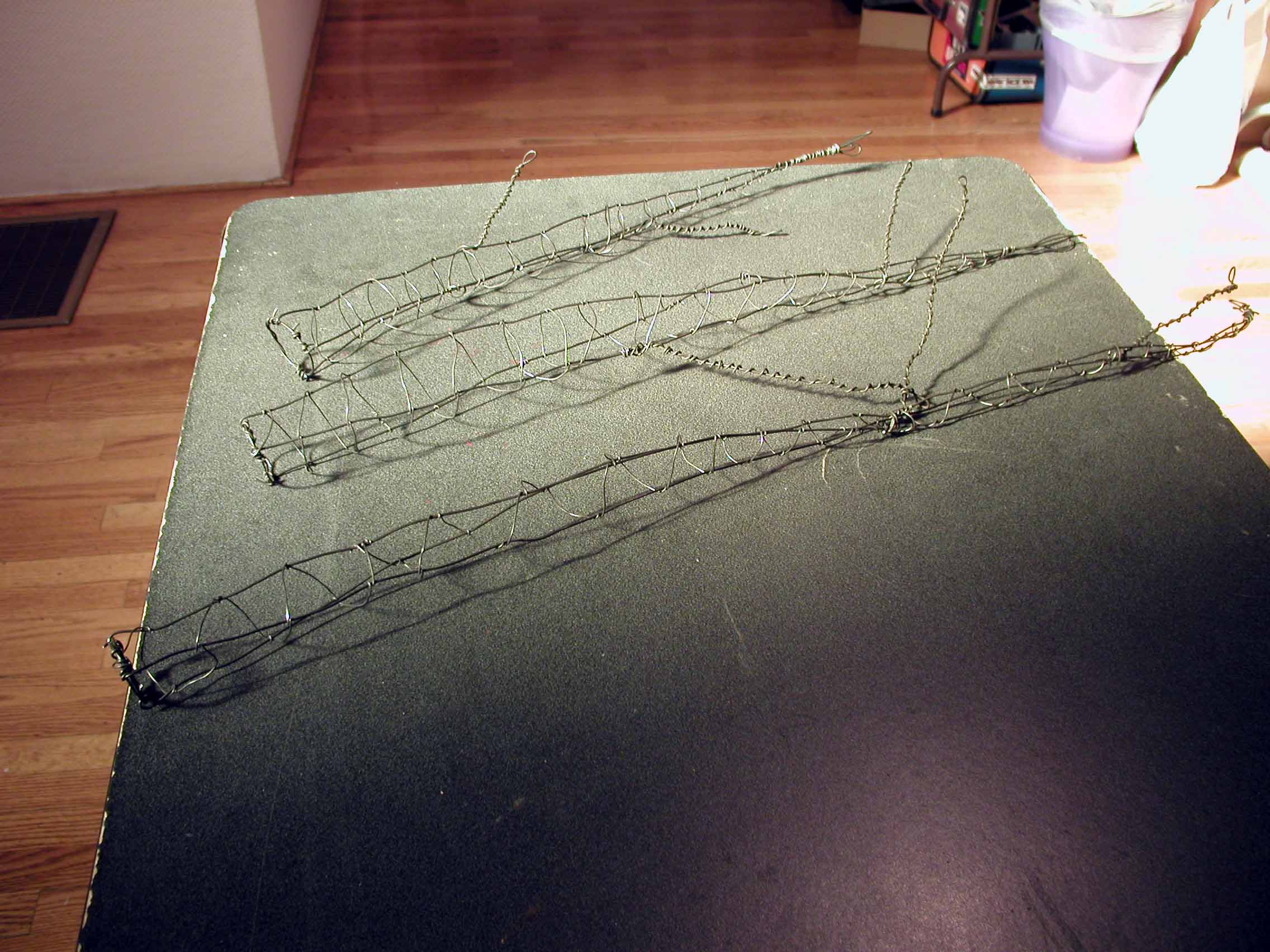 Below she used plastic coated wire and staples to create an interesting design. Makes me wonder what will happen next with that piece. The white and black dimensional design was originally “sketched” using black electrical tape on white paper (visible in the top image in the center of her table).