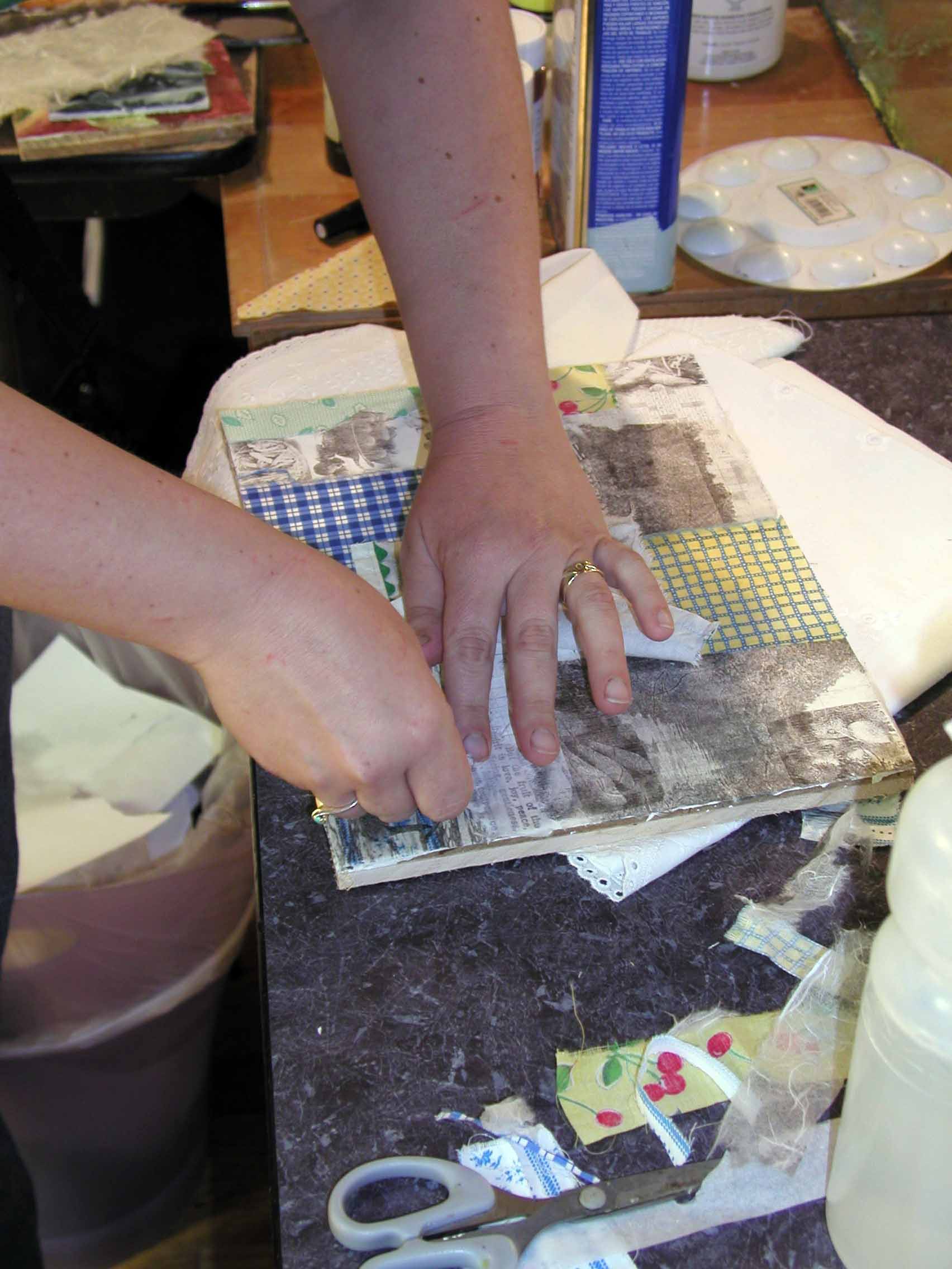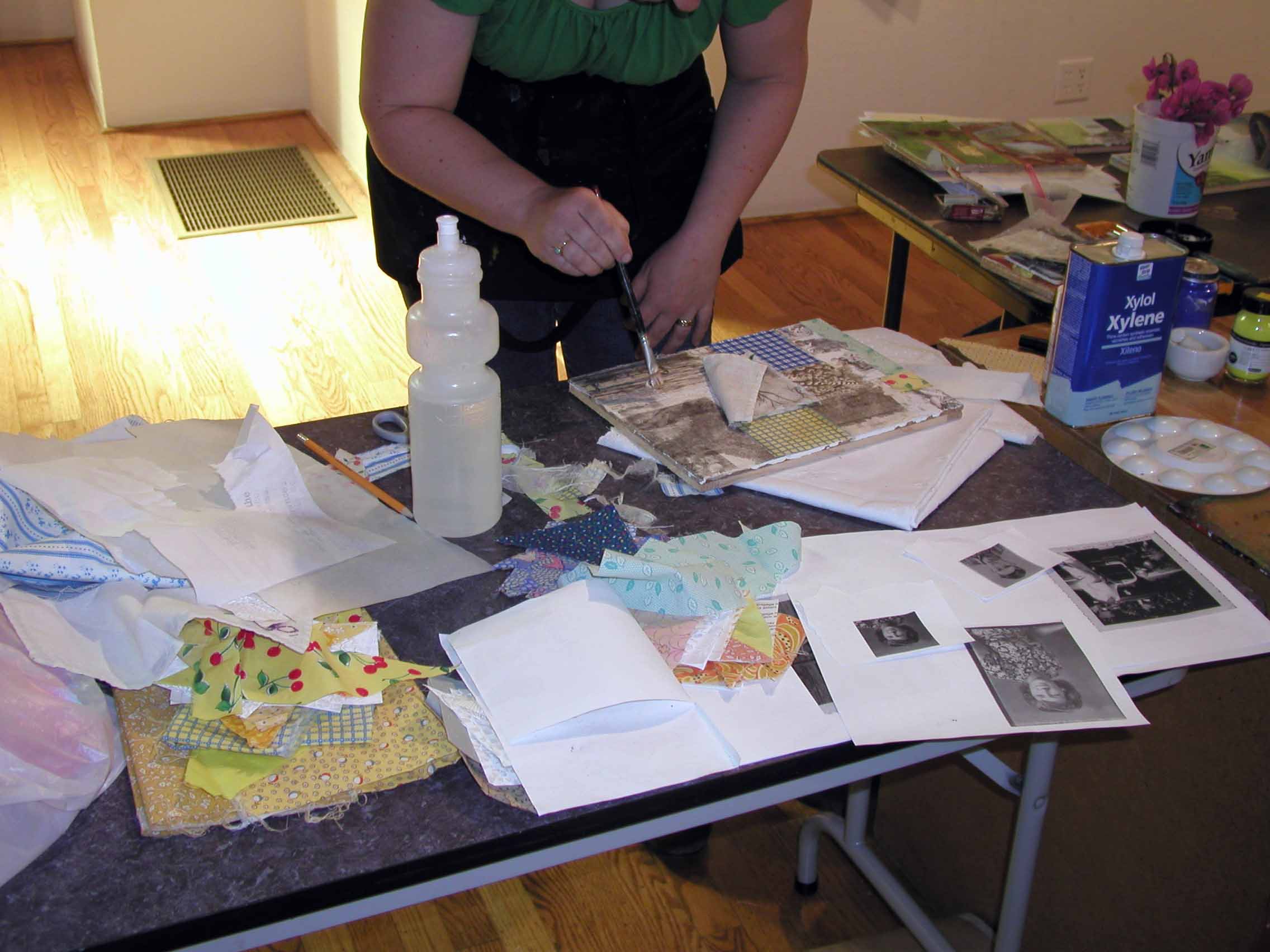 Julia Lont was busy today. Part of her artwork was bringing in an edible creation: a wonderful fresh baked Marion Berry pie! So tasty! With her 2D collage, she started incorporating fabric.