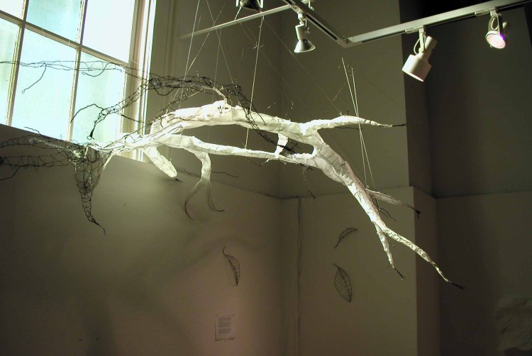 Kind of a ghostly skeleton branch structure. I’m thinking the leaves will remain uncovered for now. Many people have been asking if the leaves were for sale. For a limited time there are 3 leaves available in the shop space ($15 each). There might be more after the structure is dismantled!