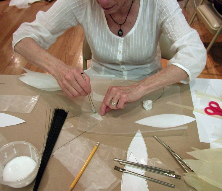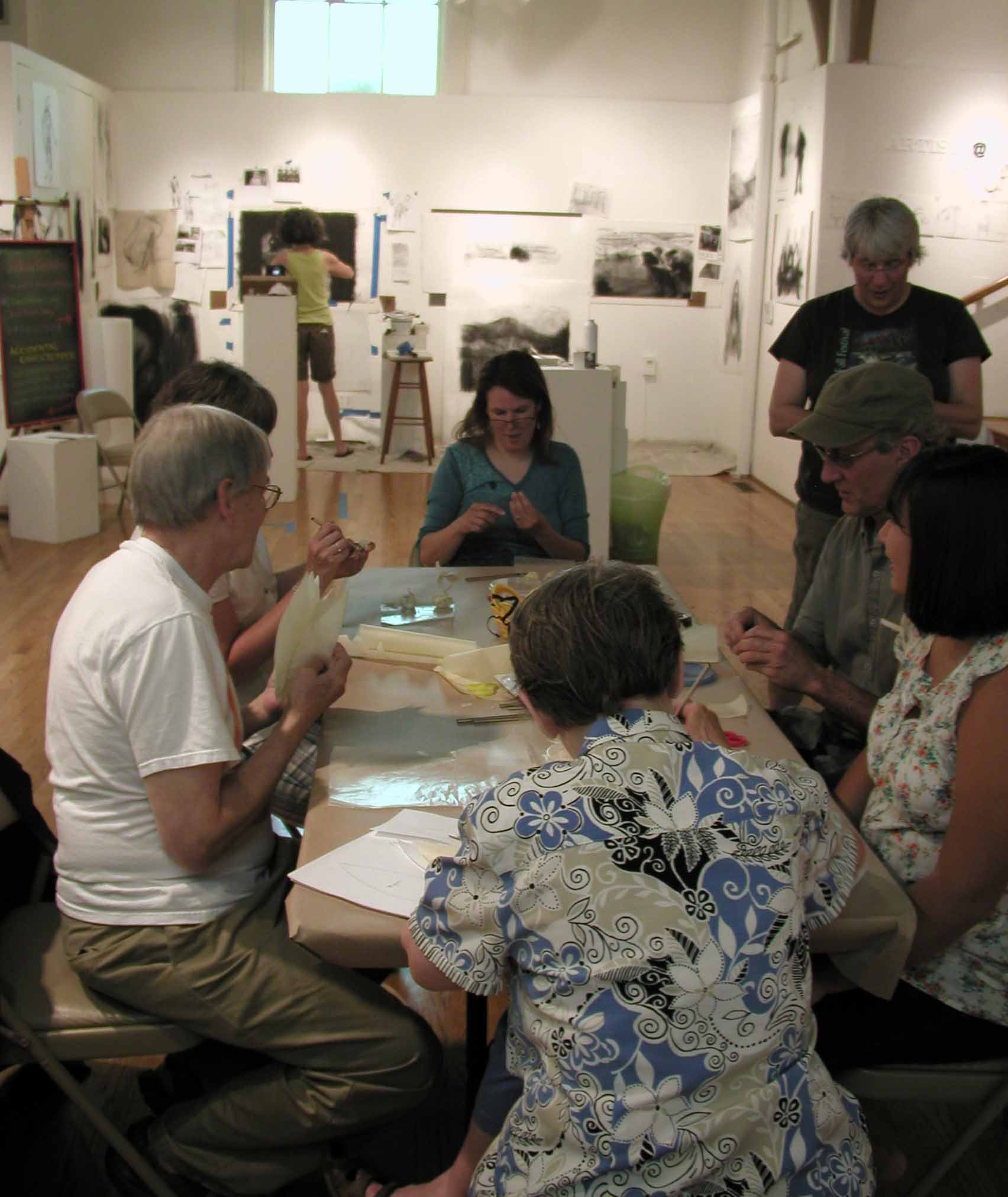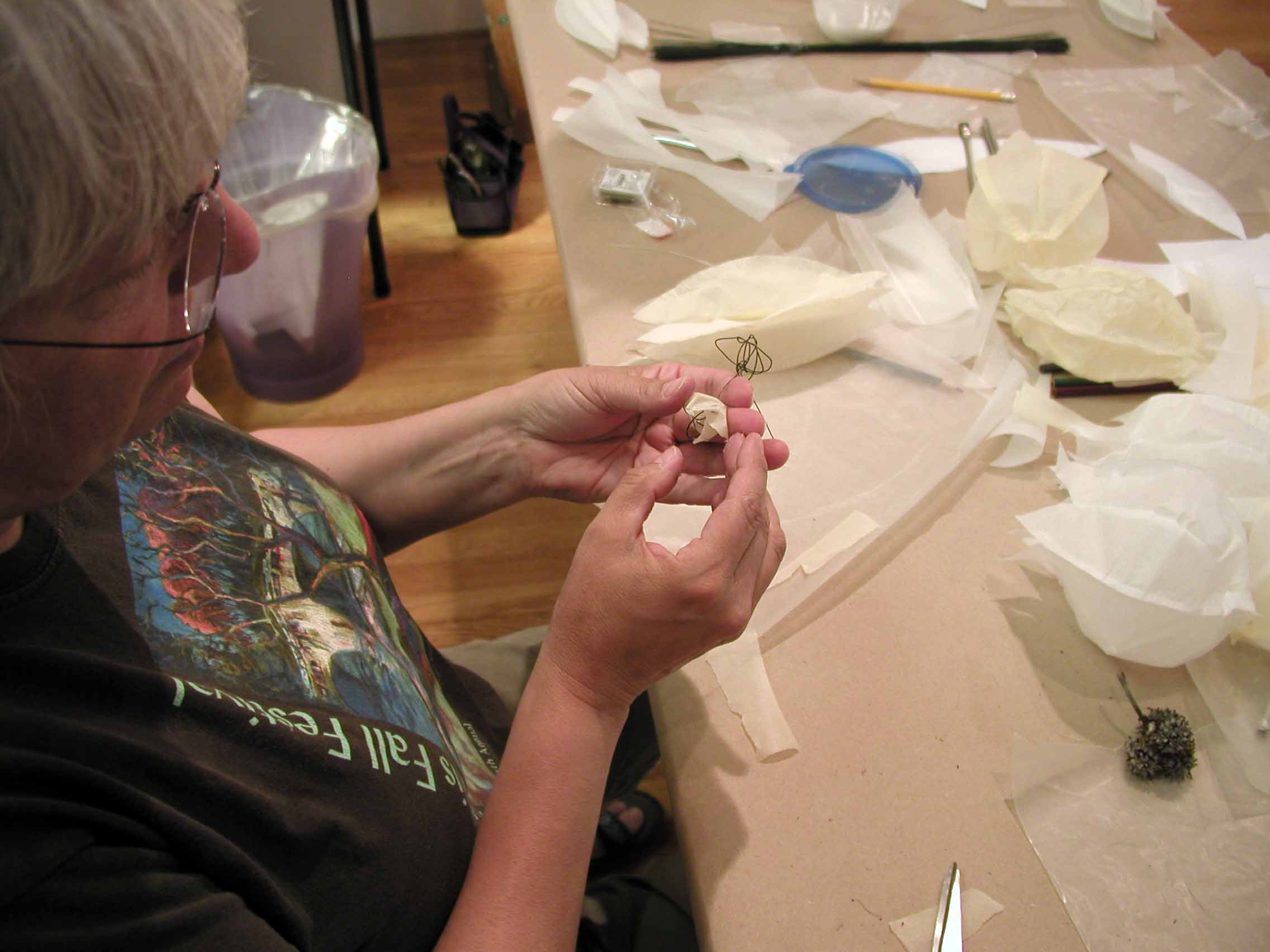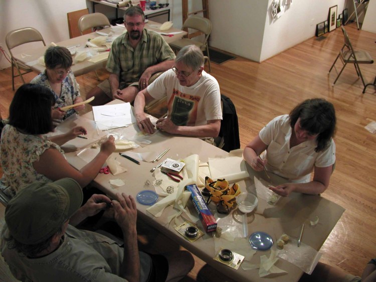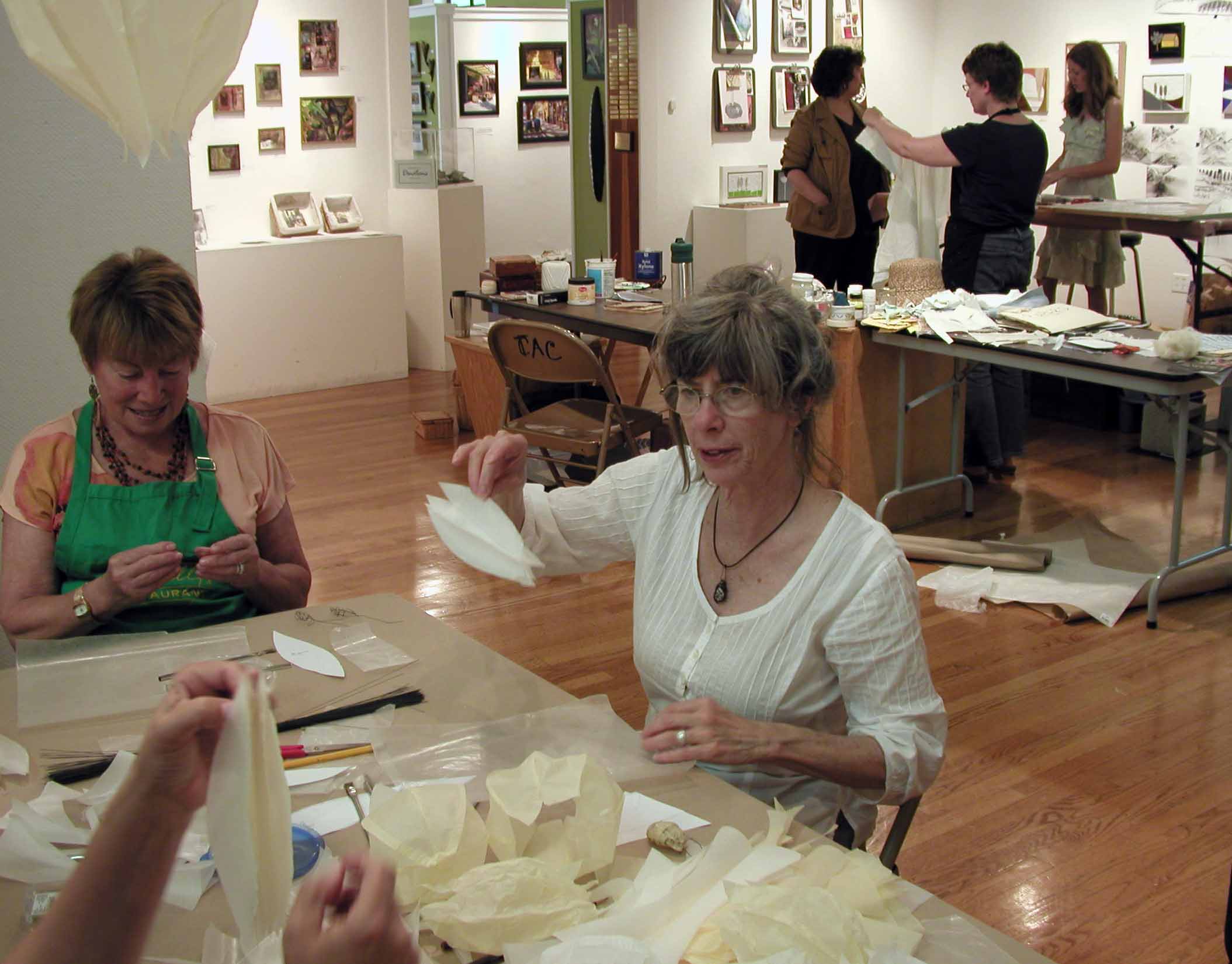 Today was the last Saturday of our exhibit and the Seed Pod workshop. Not knowing how many people would attend the workshop or how to deal with people coming in at different times was hard, but my two helpers did an excellent job! A total of 15 people came to play in paper, including the assistants. Whew! There were possibly a few more who would have liked to participate but table space was limited. I’m sorry we couldn’t fit George & Nick into the group! Below are the images from the workshop.