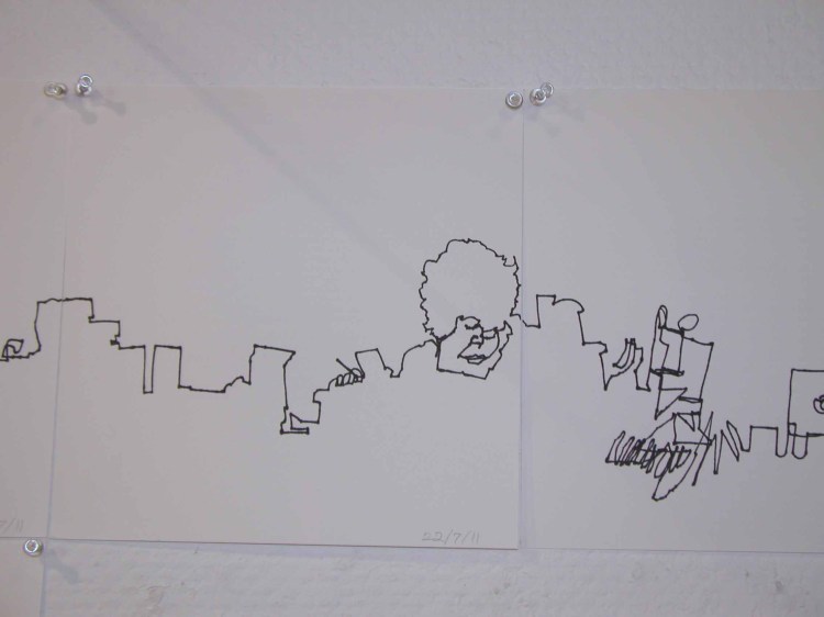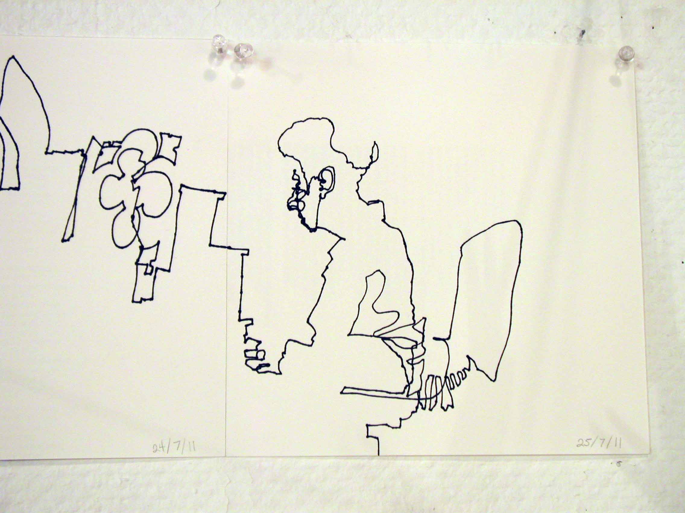 Now on to Elaine’s blind contour drawings. She managed to work her way around the main gallery and into the front shop space. I felt compelled to include the next two images due to two Arts Center employees who were included: Suzanne & Hester!