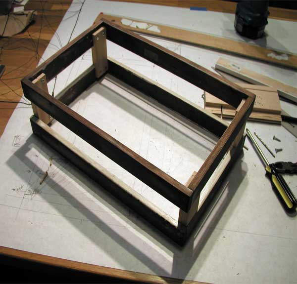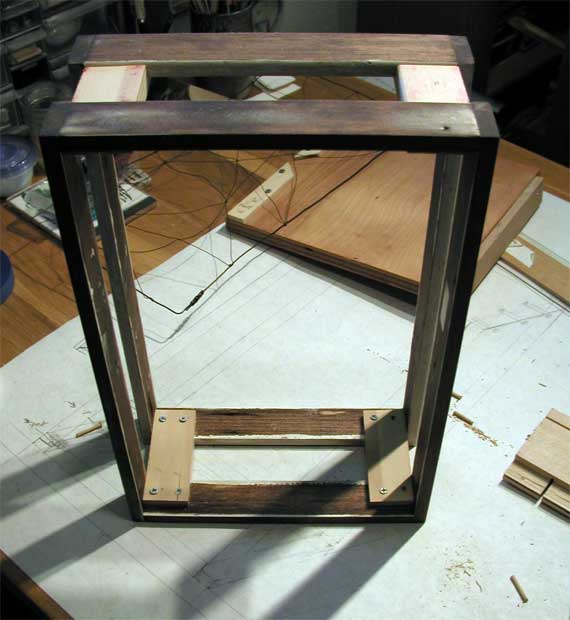 The wood is recycled hemlock trim from one of the doors in the house. I yanked the nails, sanded the heck out of it and stained it with a dark walnut Danish Oil. Peew! It’s still out gassing and probably not the best thing to be breathing in. The main frames are secured together using wood glue and dowels. Spacer blocks are attached using wood screws.