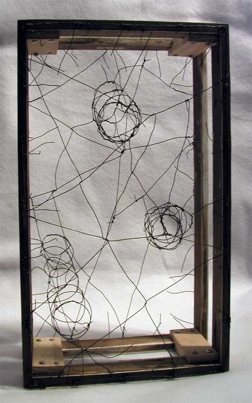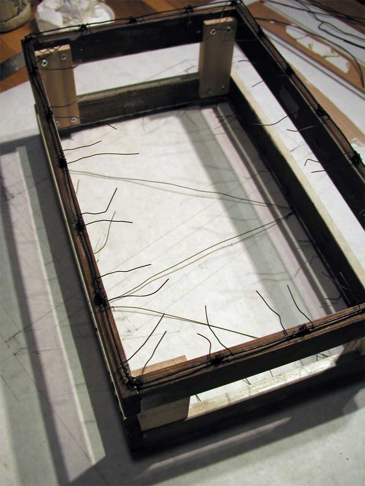 Here is today’s progression: Finished attaching 16g wire to staples and started stringing 22g across surface.