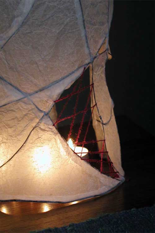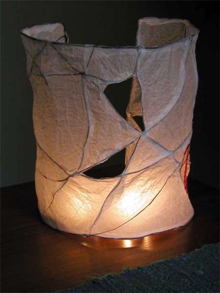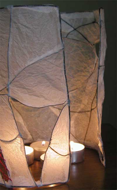 Back in August I created a “panel” to demo my concept. Now that the main work is in progress, the panel has become an excellent test unit. I curved it to fit around several tea candles and covered it with sections of paper & PVA glue.