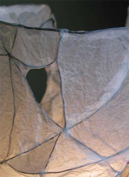 So far I think this will work with the new structure. I’m intrigued by the crinkled texture of the paper and how it makes me think of intestine, but more durable than the hog gut available. There is a coat made from intestines in the Jensen Arctic Museum collection that reminds me of this appearance. The stitching was inspired by a jeweler. Actually there have been several works I’ve seen of late with interesting stitching… I think the portal piece just might have some too.