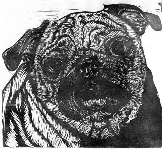 It’s been almost a week since working on Annie. My mental deadline for accomplishing 4 dog prints before Thanksgiving has been blown. Oh well! Life happens amongst art projects.  Still working my way to the center of this block (nose & mouth zone) and trying to figure out how the scarf should be draping around her neck plus what color to use. If you’ve forgotten, this is a 7″x 7″ proof of the block. That’s why the inking looks so terrible.