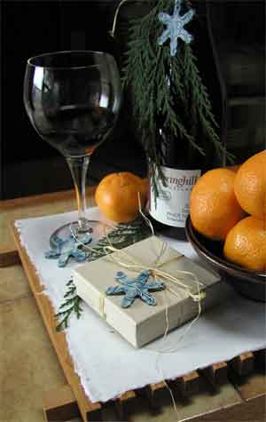 I’m spending part of my day working on photos for the new Etsy account. How does one best represent a simple ornament? Do you hang them, prop them up, use them with other items? Do I try to make a background that’s a single color or use fabric or paper under the works? What will best help sell these little guys?  What target market am I going for? This morning I had inspiration thinking about how people could use the ornaments. Why not for wine bottle decoration, gift box toppers, or wine charms? Take a look at what came up.