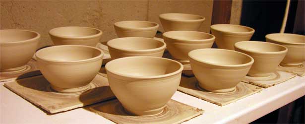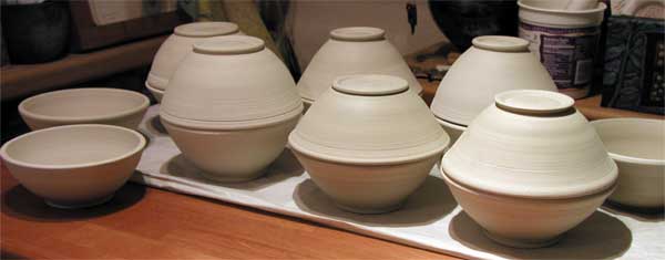 The bowl size has changed to maximize clay. They are starting out with just over a pound of clay. The first 25# yielded 16 bowls minus 2 flubs, averaging 1.5# starting weight. Now I’m working on my second 25# bag of Georgie’s White Salmon clay which should yield 20 bowls. So far 12 bowls thrown today and plenty more hours ahead before dinner. Or is there? Below image is current batch o’bowls