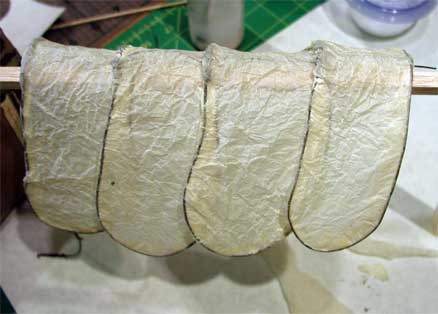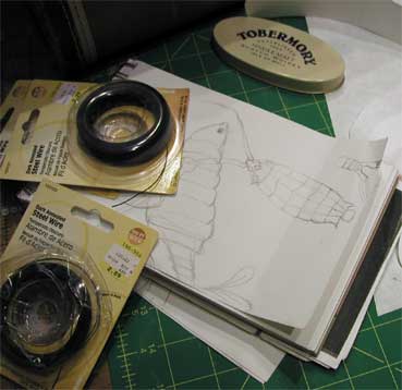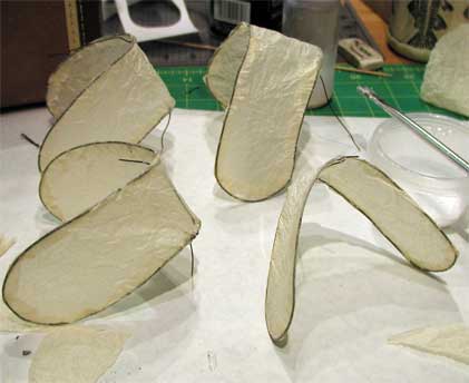 After bending, I located some crumpled tracing paper. The paper was then torn, glued and wrapped around the wire form to create the exoskeleton.