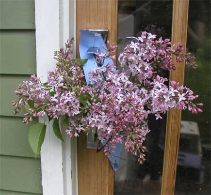As a child, May Day was always special. My mother helped me cut flowers & assemble little cone baskets to deliver to the neighbors. After assembly,  I ran up to our neighbors homes, hung the baskets on the door, rang the bell and ran away! Today, the lilacs are blooming and I’ve assembled a cone for my neighbor Gail. Hopefully she’ll see it when returning from work. This is probably the first basket created in over 35 years!  I took the photo at my house because I thought it would look silly taking a photo at her front door.  🙂