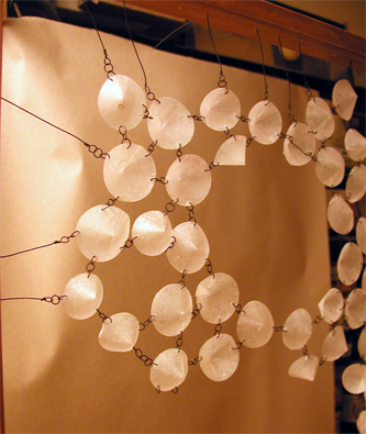 Creating the frame and stand took me several days plus extra time getting equipment back in running order. I did learn how to change blades on my table saw and tighten the blade on the chop saw. Today I started filling the frame with paper & wire. It’s taking forever due to all the adjustments.
