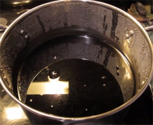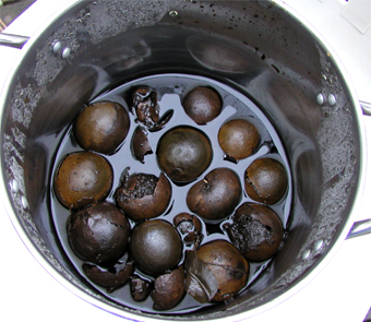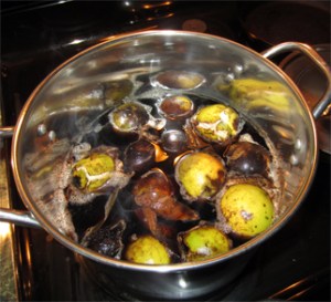 I spent a little time picking up fallen walnuts in the area, some with green coatings while others had already started to deteriorate into a dark brown mess. I tossed them into a pot, filled with a gallon or so of water and boiled for 20 min. There was an art critique meeting that night so I shut off the heat and left the pot covered on the stove.