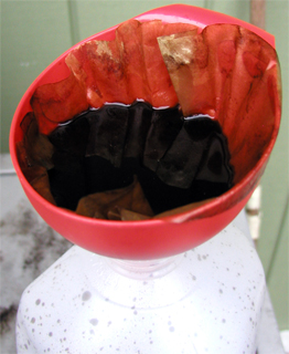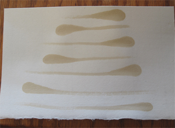 How far should the reduction go? I wasn’t certain if the 20 min of heat would produce a dark enough color so a quick test was done. A scrap of Hosho paper received a few brush strokes from the liquid. The paper was much thicker than what will be used for the project. Will it be enough? I’ll give it a go for now. If I need it darker, I’ll reduce my stock in half.