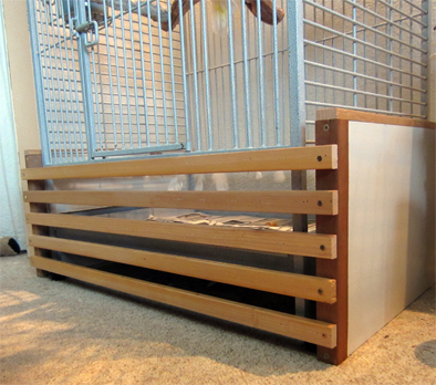 Since this project went so well, I decided to use the same principal for protecting the cockatoo’s cage. When left alone, Moby always pulls out the seed/poo tray and spreads everything all over the upstairs. Paper, bird seed, broken up wood blocks, the works! Birds are messy enough, but to have the dog helping out really sucks. Now Mr. B is fully enclosed and I won’t have to worry about the pan getting pulled out. Less vacuum time! Hurray! The slats were originally to become trim around interior windows but I used them to sort out the fish project in November. I don’t think Barnaby will mind all the little holes drilled through them. 😉