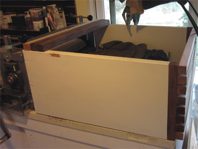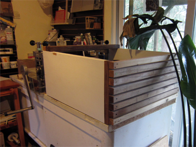 For some reason, I happen to be the owner of a crazy freak dog who is determined to keep my attention at all cost. If I happen to ignore him, he runs around the house and gets into trouble. This means I stop what I’m doing, run after him and yank whatever he’s acquired out of his mouth. Yes, his reward is getting my attention. I really do need to address my behavior! Anyway, he loves to raid the bathroom for hand towels, any stray socks or shirts not placed in the hamper, and the cat bed on top of the etching press when accessible. Over the past year the press has been hiding behind large pieces of sheet rock, waiting to be installed in the downstairs bath. This makes it rather inconvenient to use the press. I finally hit the “fed up” level and started clearing out all the non-art stuff from the studio. The cat, having benefited from the sheet rock shields, was now fair game. Not for long! I created protection for my Nigel. It just so happens that the garage harbors quantities of recycled materials from other projects gone-a fowl. A bi-fold closet door was utilized with extra cedar from our back deck railing to create the enclosure. Not too horrible to look at and it’s light weight.