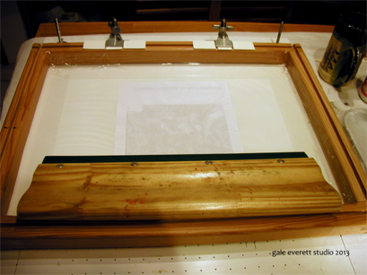 Today, I took a break from dealing with the estate to do another chore holding up the next print. Screen prep! My father left behind many frames for screen printing. Most are empty, some have one system for holding screens in place, others have the revised method. Four screens still have images of his work , which will remain so I can utilize them for family projects. Those 4 screens all have hinge hardware set in place (hardware I can’t get additional of due to their age). I love the hinge system and have used it for years but the new screens lack hinges. Fortunately, there is a way around this! Amongst the piles in the studio, a pair of Speedball screen clamps have resided for many years, untouched! They are finally getting a chance to be USED! Below are some images of the new approach. I’ll let you know how it works.