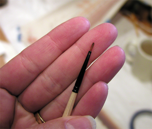 Now, the tool that does most of the technical work is one little brush. I received it during an ArtFest workshop but for the life of me, I can’t recall which class. Who ever it was RAVED about this little brush and made sure we all had one. She must have been a painter… Marybeth Shaw possibly? It’s label says: 3/0 Black Gold by Dynasty. I’m not a painter, so it doesn’t matter much except it works for my application.