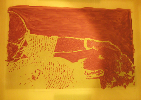 Below is the screen ready to print the fifth color. All the red stuff is screen filler (yellow is the screen) which is applied prior to every color change. It doesn’t get washed out nor do I exchange screens. This is what’s referred to as a reduction screen print. One keeps filling/blocking off more of the screen with each change of color.