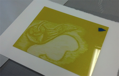 After inking the plate, I placed it over the photocopy and set about removing all areas to remain white, red, blue & purple using Q-Tips. Whew! Kind of tough to keep straight in the brain! I also used tarlatan (scrim), sponges, paper towels and kebab skewers for texture/ink removal. The below image is the yellow plate placed on top of dry paper ready to be put through the intaglio press.