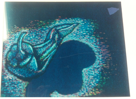 Now the finished print. Overall, this was a challenging process to go through and keep straight. I didn’t manage the black-black background I had hoped for. Part of that had to do with not applying enough ink onto the plates. Part could be from pressure. I also hadn’t planned what colors would go where so the image just developed as I went along. Kind of wild and crazy for me!