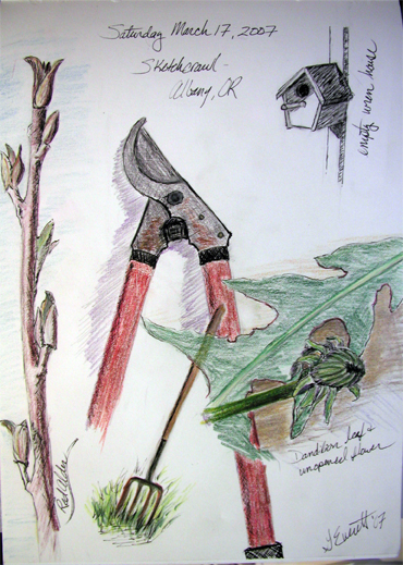 Life has been rather emotionally swamped this week. Artwork has been put aside so as to start working on clearing out my parents home. The insurance company came by Thursday and drop off the check for the totaled VW.Β This weekend, there is a scheduled meeting of the siblings to determine what to do with all the property. One brother is more challenging to work with and I’m not looking forward to this event. Dread is more like it. So, today dear readers you get a sketch page from back in 2007. Life certainly was a lot easier back then. That particular day was spent doing yard work. Cutting blackberry vines, pulling weeds, tossing debris onto the burn pile. I just don’t know where to put my energy right now. So many things that need to be done in so many areas and I’m feeling like it’s all pulling me apart (siblings, lawyers, bankers, renters). I just have to keep reminding myself to take baby steps and everything will eventually work out for the best.