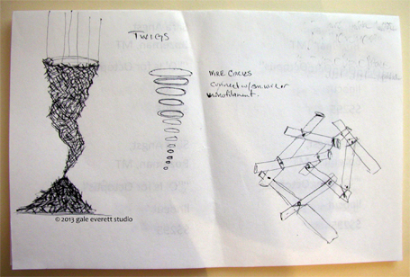Since I wasn’t selected for the local installation project, I’ve been contemplating creating a smaller scale version of a different idea. The artwork has resided in my brain for about 6 years and it’s time to do something about it. Below is the starting doodle/scribble. It will be constructed using short lengths of branch (2-3″) that are drilled and wired together. The part holding me back is figuring out a good internal support system (and creation space). The branches don’t weigh terribly much, but they will after being wired together. The joints are also a concern as they dry and become brittle over time. I need to create an inner ring system to support everything. The rings would be connected together, taking the stress off the branch joints. The overall look will be kind of like a tornado of branches suspended over a conical pile of branches.