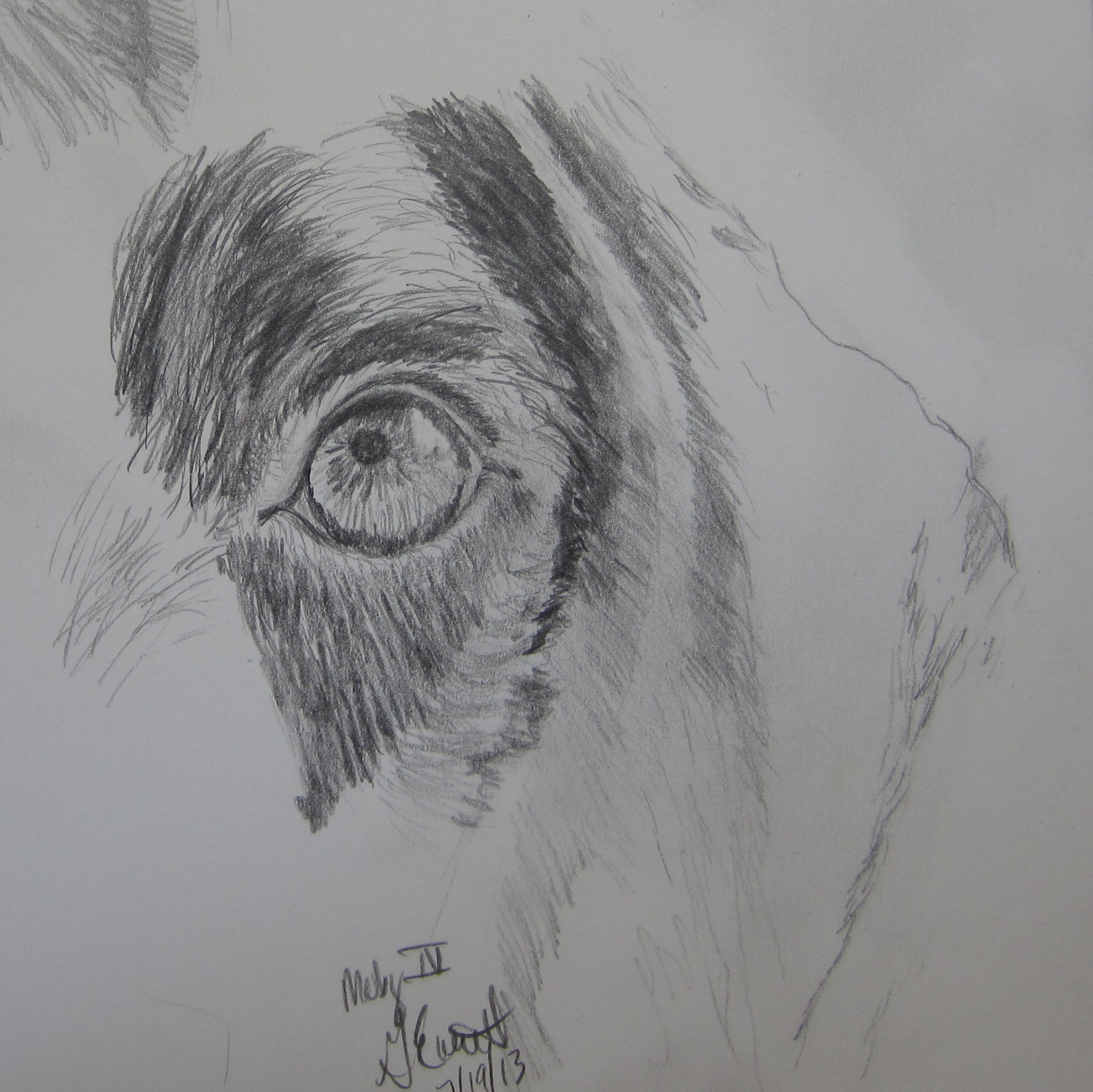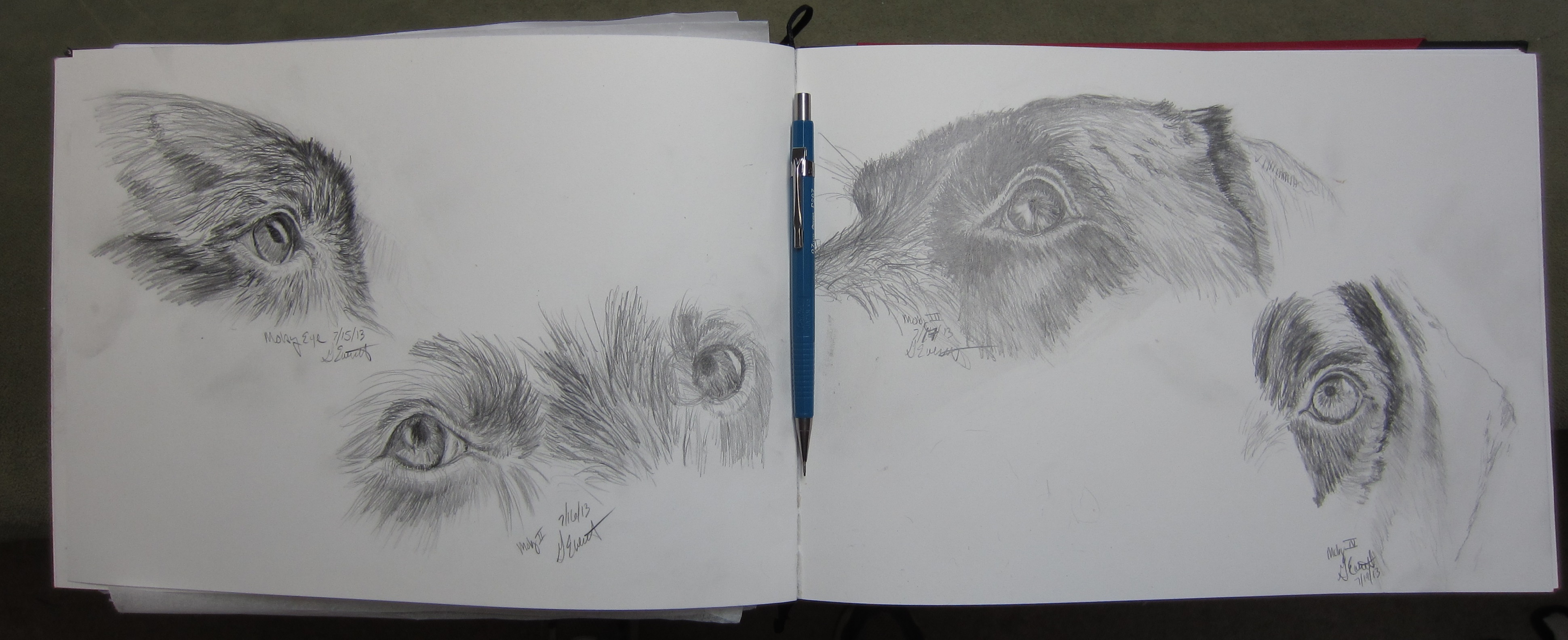 Last night I was too tired and hot to even consider picking up a pencil. My day had been filled with more time in Eugene working on the house. Dinner didn’t even come together until after 9pm, but those pesto turkey burgers were yummy! Moby’s next image came this morning as I worked on my cup of coffee. Not a bunch of time to draw, but enough to capture another angle. Below is an image of the open sketchbook. Still have some areas to keep working more drawings into.