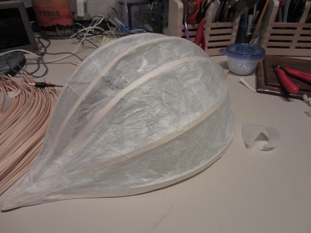 Yesterday the rattan arrived and I jumped into creating another pod (thinking I might have a remote chance of finishing another before the festival). Now I have plenty of time to work through this one. Ok, there isn’t much more to do except copper trim & another couple paper layers on the interior. The below photo is from yesterday evening before copper spikes.