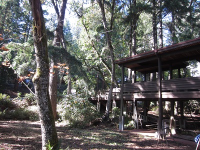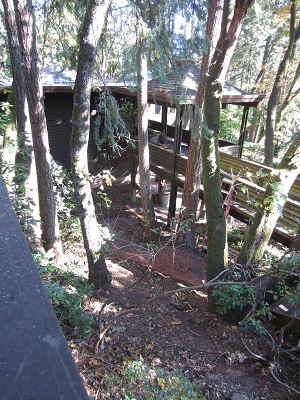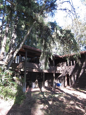 This post is for my family scattered across the country who have been wondering about the old home. I thought it might be fun to post a couple of photos of the house. It’s currently getting lots of work done in anticipation of selling… eventually.  Tuesday we had numerous tree guys climb all over the roof and up tall trees to cut down dangerous limbs and make things more presentable. Plus they tied back Rhodies and a few trees that have been resting on the decks and railings. The photos are of the front yard/walkways only. The back is still in need of work.
