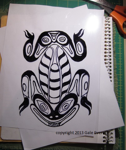 A rather goofy looking frog drawing but there is a history to it. Long ago (probably back in the 50’s/60’s) someone in my family, possibly my grandmother, purchased a couple of sets of placemats and napkins from the local arts center. These placemats had a formline frog image. Both she and my parents had a great fondness of indigenous art of Pacific Northwest coastal tribes. The placemats were used a fair amount and I recalled them from my childhood. A couple of years back I rediscovered them and wanted to create sets for each of my siblings. Last year I managed to purchase fabric and get things cut but it never advanced farther. Friday I started goofing around with the design, trying to see what works for my taste. It’s still super rough and will need more refining, but the idea is there.