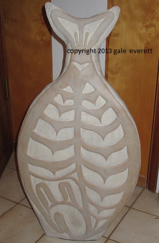 It’s 30″x 15″ and 4″ wide at it’s base. The back side has all the negative forms. Several of the negative forms didn’t adhere well enough and cracked or peeled away from the surface. Oh well, another disaster. At least one side looked fairly cool. I had always wanted to attach twined cedar bark around the tail lid and create a halibut hook. It went through a high fire without any stain or surface glaze treatment. Raw clay in the fully cooked color.