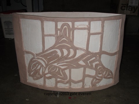 I’ve played around with some formline critters before in clay. Formline art consists of ovids, U and S shapes. It’s very much part of the indigenous coastal art (think Haida or Tlingit tribes). If you’re not familiar with it, you might want to check out Wikipedia. Below are failed vessel experiments I created about 10 years ago. The first couple are of an Orca design. The finished vessel measured about 22″ long by 14″ high, by 7″ wide (ellipse form). It had a mirror image on the other side. Bummer it blew-out in the bisque. How was it created? I transferred my drawing to a 1/4″ slab and created the cut out form. Then it was slipped & scored and attached onto an existing leather hard vessel. Way too many air gaps were created while trying to join the two together, plus the difference in clay consistency probably pushed the limits. Explosions in the kiln. Bummer! But I tried it again, thinking a second attempt would be better. Oh, I did destroy Orca #1. It only took a couple of blows from the hammer to do the job.