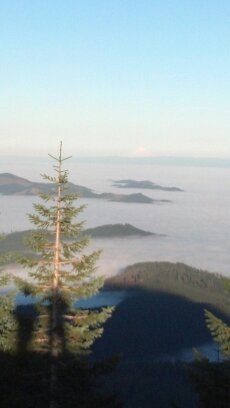 Saturday we went in search of SUNSHINE! We’ve been socked in for days (weeks) in the valley. Grey days with little temperature change makes for depressing winters. We drove to the coast range and up Mary’s Peak. From the upper parking, situated at around 4,ooo feet, you can look out over the valley to all the mountains. Mt. St Helens (in Washington State), Mt. Hood, Mt. Jefferson, the Three Sisters, and Bachelor were all visible. Mt. Hood is in the image above complete with our long afternoon shadows. It’s fun to see all the lower peaks sticking up out of the fog. Islands among a sea of fog.