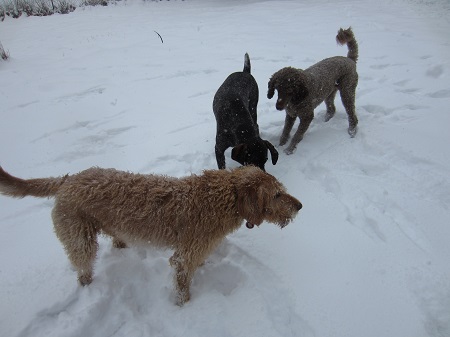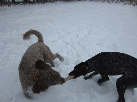 The computer models said we might be in the path of snow, but do we ever believe the weather folks? They were right this time.  It started this morning and hasn’t let up yet. Our temp is around 22F (-5C) and we’ve accumulated over 5.25″ (13 cm ) of snow.  I realize it’s just a drop in the bucket compared to other parts of the country, but it’s big for us. The dogs are enjoying it and dragging in loads of snowballs to gently melt on the carpet. Oh, how I love those furry guys and the gifts they bring in. *Sigh*