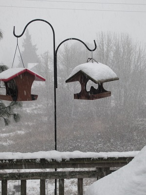 Below are 2 photos taken 1.5 hours apart. I had just put out a new bird feeder (top photo) at 8:30 am and was pretty impressed at the snow accumulation (bottom photo) by 10 am. Sure glad to make the little guys so happy. I probably should have stocked up on more food for us!