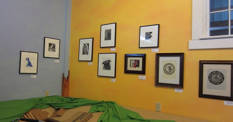 Julia Lont’s Bluebird, Carol Chapel’s frog and the large monotype by Debby Sundbaum- Sommers (3 color separation).