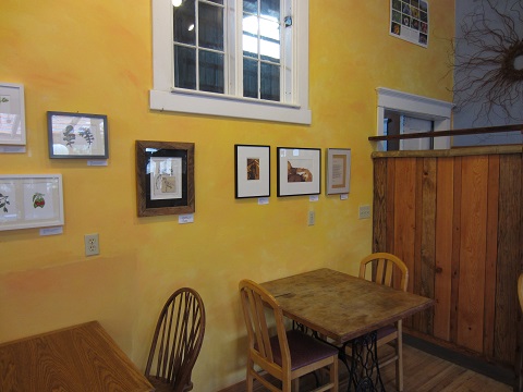There is one long yellow wall and part of the blue wall to hang work on. The sloped counter top is normally filled with fresh veggies, but most of the root crop and local wines had to be moved to gain wall access. My dogs took up residence starting on the blue wall and spread into Carol Chapel and Victoria Martinez. The photos progress down the long wall.